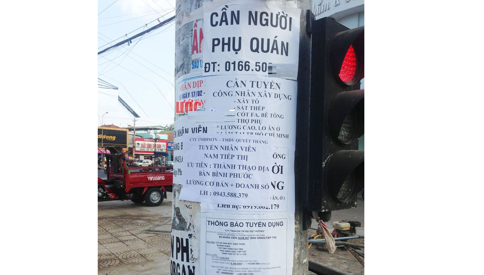 1 giờ chiều trời vẫn còn nắng cháy, tôi lại tiếp tục lao xe ra đường và chăm chú nhìn trên cột điện, chợt thấy 1 tờ giấy A4 rất mới ghi có tuyển người làm bao ăn ở, tôi gọi ngay và được một chị bảo qua đường Bình Long để phỏng vấn, tới nơi tôi nhận ra đó lại là một trung tâm giới thiệu việc làm “miễn phí’’, cũng chẳng còn cách nào nên tôi đành bước vào.